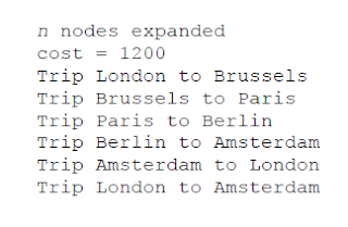 The above example does not have a unique optimal solution. One valid output corresponding to the above input is as follows. The first line in the output should give the number of nodes n expanded in your search, the number of nodes taken off the queue, which will vary according to the heuristic used. The second line of the output should give the cost of the solution found as an integer, which is the total time taken, and should be the same regardless of the heuristic and the solution path. The remainder of the output should give a sequence of trips that make up an optimal solution. If your program produces a different optimal solution from the one shown (with the same cost) then it is correct.